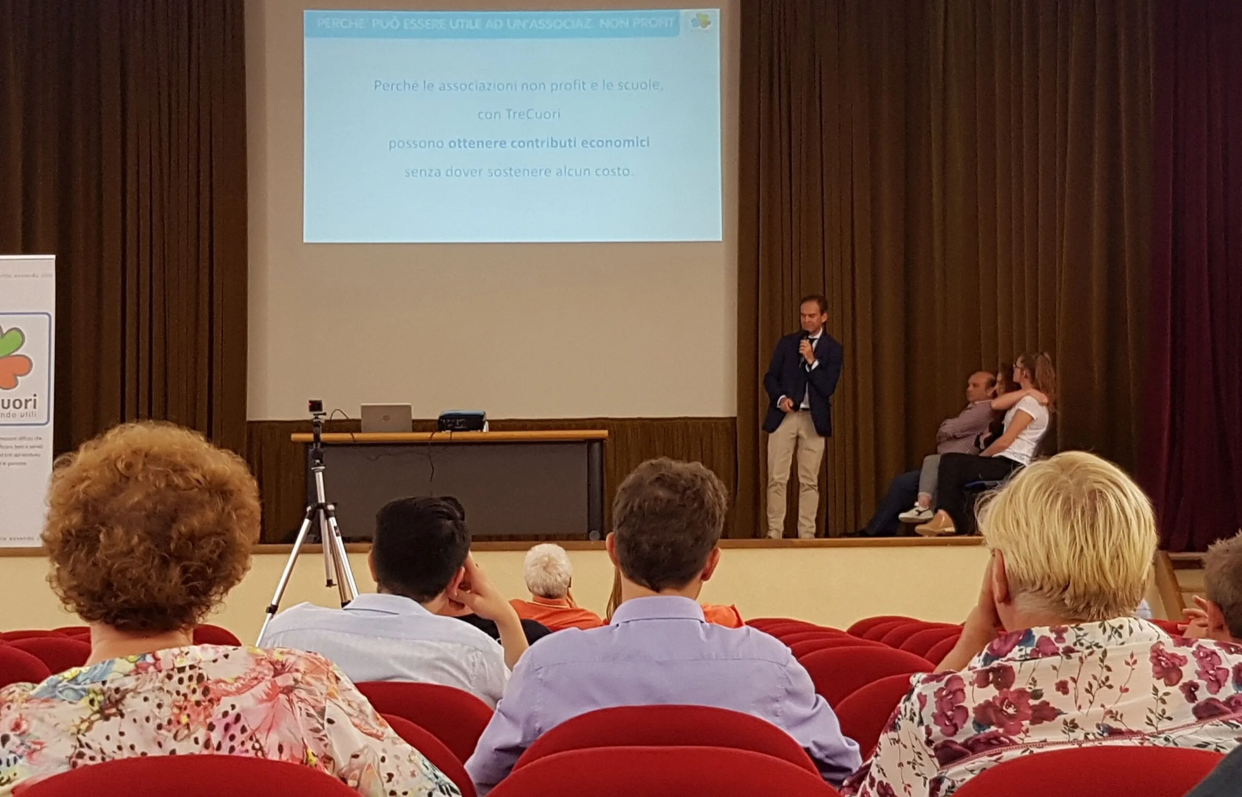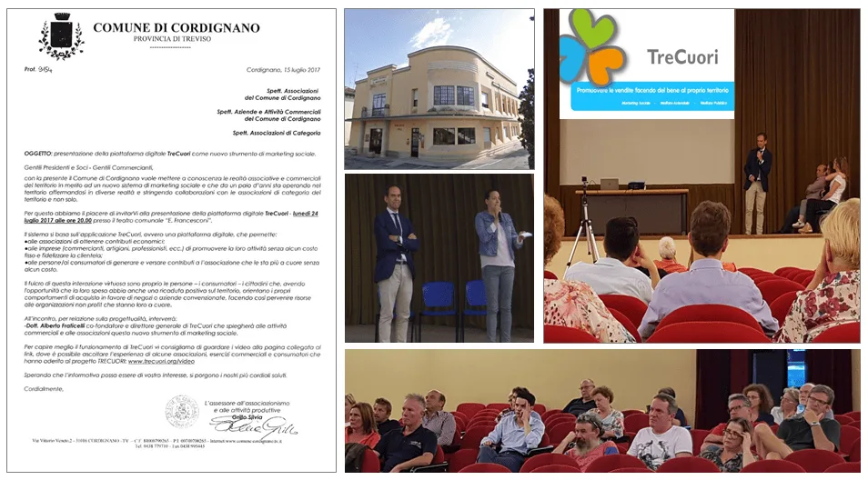 CORDIGNANO, 24 luglio 2017 – Presso il Teatro comunale Francesconi di Cordignano, ha avuto luogo la presentazione della piattaforma TreCuori, il nuovo sistema di marketing sociale e welfare pensato per favorire la prosperità dei territori, promuovendo le attività commerciali e generando contributi per enti ed associazioni non profit. Questa iniziativa è stata voluta dall’amministrazione comunale interessata a replicare le esperienze positive che altri territori hanno già attivato in altre zone d’Italia. La serata è stata introdotta dall’assessore all’associazionismo e alle attività produttive Silvia Grillo ed è poi entrata nei dettagli dell’argomento con Alberto Fraticelli, direttore di TreCuori Società Benefit. Erano presenti vari esponenti del tessuto socio-economico della zona, con commercianti e imprenditori, responsabili di associazioni non profit e cittadini, tutti accomunati dall’interesse ad ottenere benefici grazie all’avviamento del circolo virtuoso per il bene comune che TreCuori attiva.