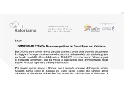 Per erogare queste risorse, i Comuni, con il supporto operativo dell’Impresa sociale Girasole, hanno scelto la modalità dei Buoni Spesa Solidali che saranno gestiti attraverso la piattaforma digitale TreCuori grazie alla collaborazione di Valoriamo, il progetto di welfare territoriale e comunitario attivo sul territorio lecchese da dicembre 2018, che già utilizza questo strumento per l’implementazione dei piani di welfare aziendale.