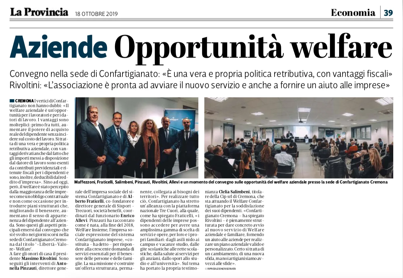 Il convegno di Confartigianato Cremona sulle ultimissime novità del Welfare Aziendale. Confartigianato Cremona presenta il nuovo, importante, “Servizio Welfare”. Martedì 15 ottobre, alle ore 18.00, presso la Sede di via Rosario a Cremona (Sala Riunioni – 3° piano), si è tenuto il convegno per illustrare le novità ed i vantaggi del Welfare Aziendale. Ne abbiamo parlato con: Antonella Pinzauti, direttore generale dell’impresa sociale del sistema Confartigianato e Alberto Fraticelli, co-founder & direttore generale di Sisport S.s.d.p.a. -TRECUORI SPA SOCIETA’ BENEFIT.