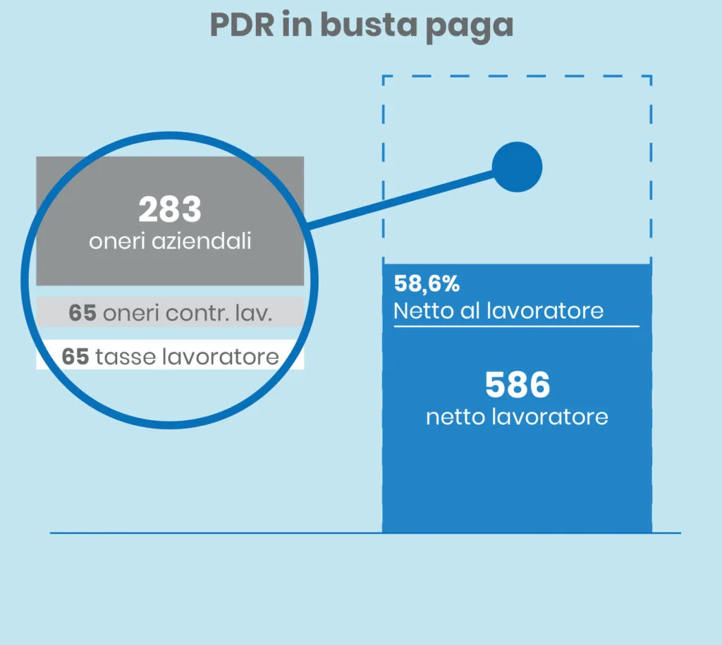 - Quando il PDR viene pagato in busta paga, viene applicata un’imposta sostitutiva del 10% (edit: per gli anni 2023 e 2024 l'imposta è pari al 5%) rispetto a quella ordinaria IRPEF, a cui si aggiunge il contributo previdenziale a carico del lavoratore che, a seconda del CCNL applicato, varia dal 9,19% al 9,49%. Quindi, le trattenute per il lavoratore, ammontano a circa il 20% dell’intero premio.