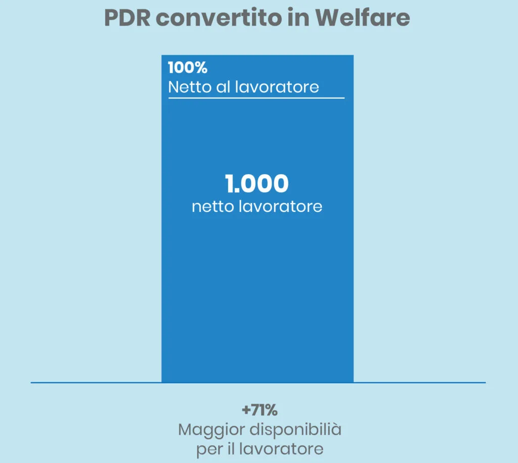 - convertendolo in welfare, l’importo che effettivamente incasserebbe il dipendente è pari a €1.000,00 ovvero pari all’importo effettivamente erogato dall’azienda. La scelta di convertire il PDR in welfare aumenterebbe la disponibilità di spesa del lavoratore dipendente di un +71%.
