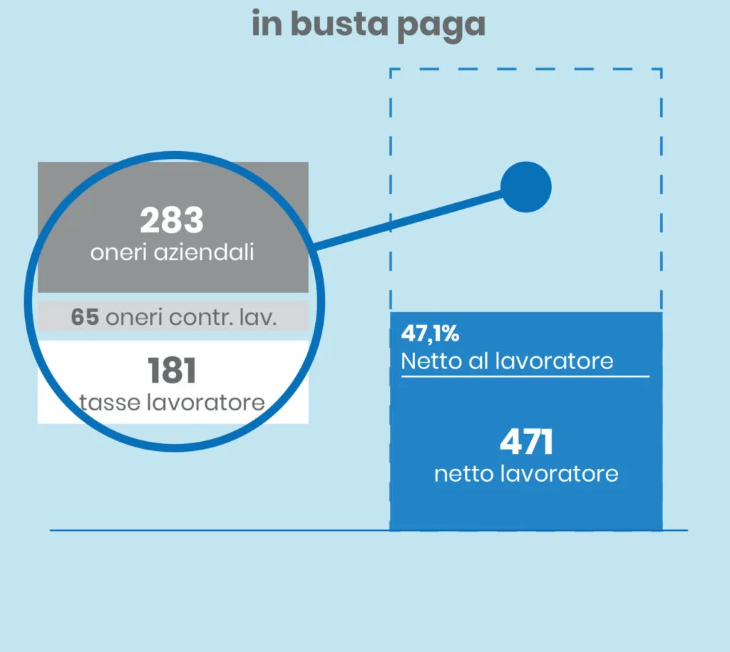 - ricevendolo in busta paga, l’importo netto che incasserebbe sarebbe pari a €586,00. A carico del dipendente graverebbero infatti €130,00 di oneri contributivi e tasse, mentre gli oneri a carico dell’azienda sarebbero pari a €283,00.