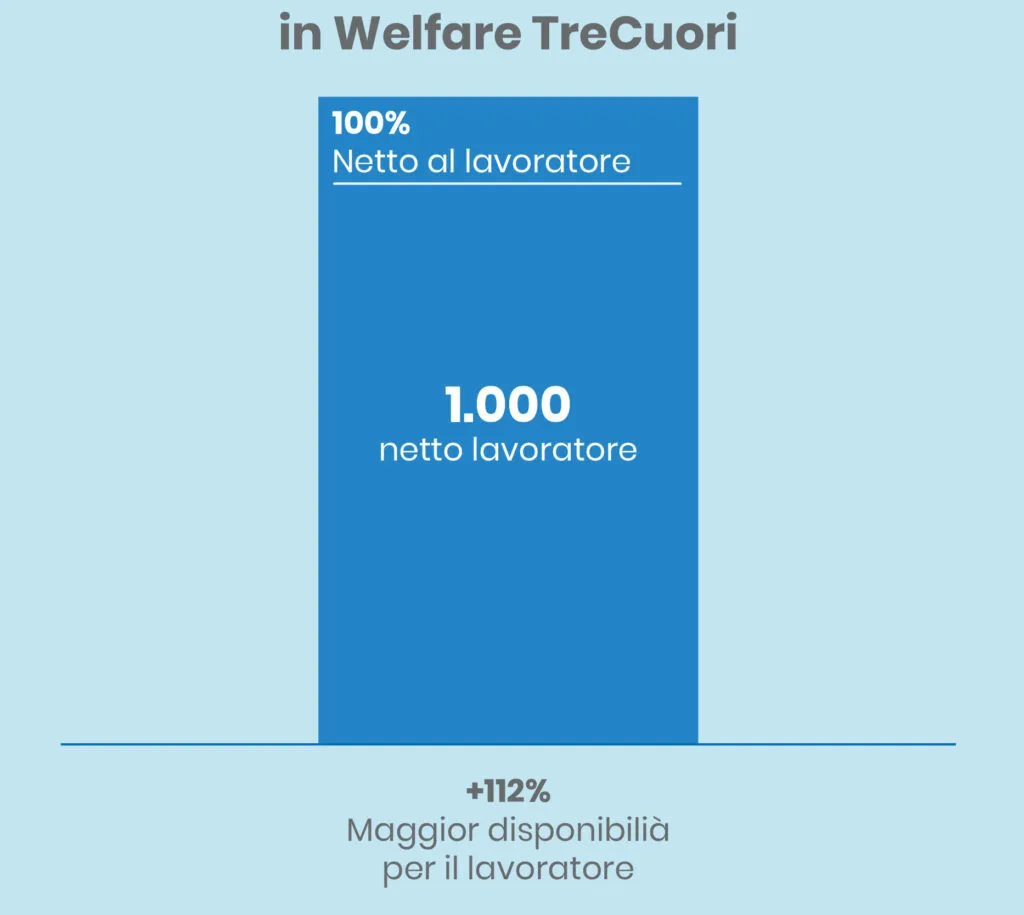 - ricevendolo come welfare, il lavoratore beneficerebbe dell’intero importo, ovvero €1.000,00. Ciò è possibile in quanto, come già esposto, il valore dei servizi welfare non è tassato, sia per quanto riguarda l’azienda che il lavoratore. L’importo totale erogato dall’azienda coinciderà dunque con l’importo effettivamente beneficiato dal lavoratore, in questo caso €1.000,00 . La maggior disponibilità di spesa per il lavoratore, rispetto all’opzione in busta, è dunque pari ad un +112%.